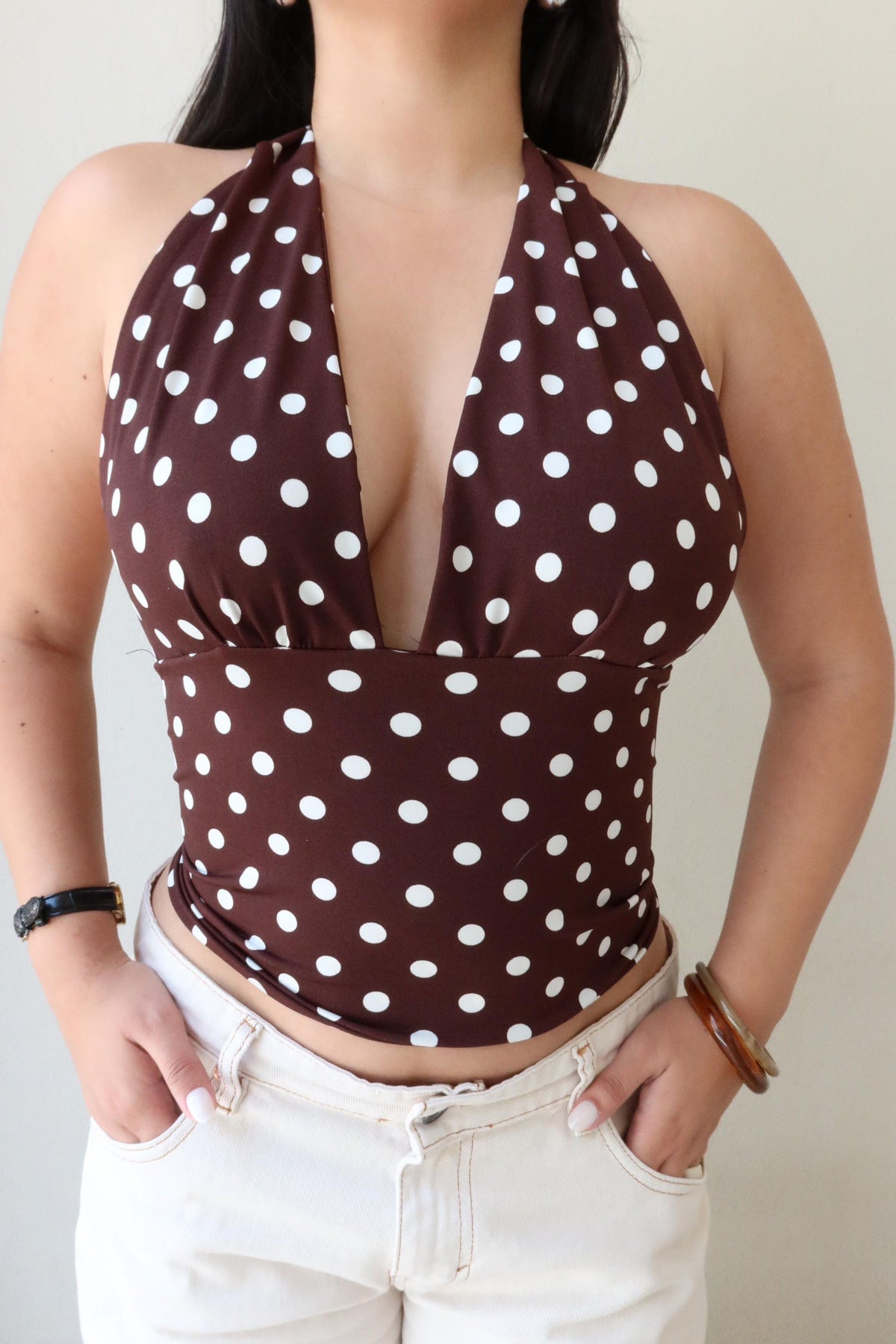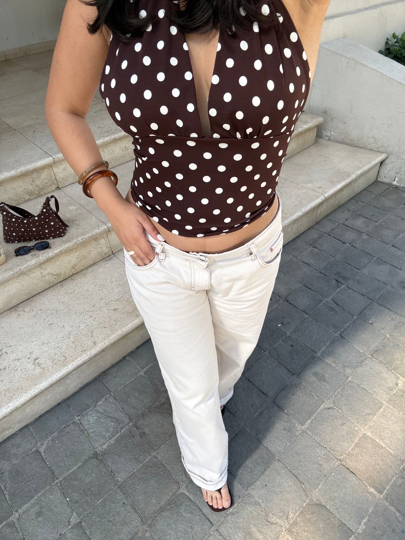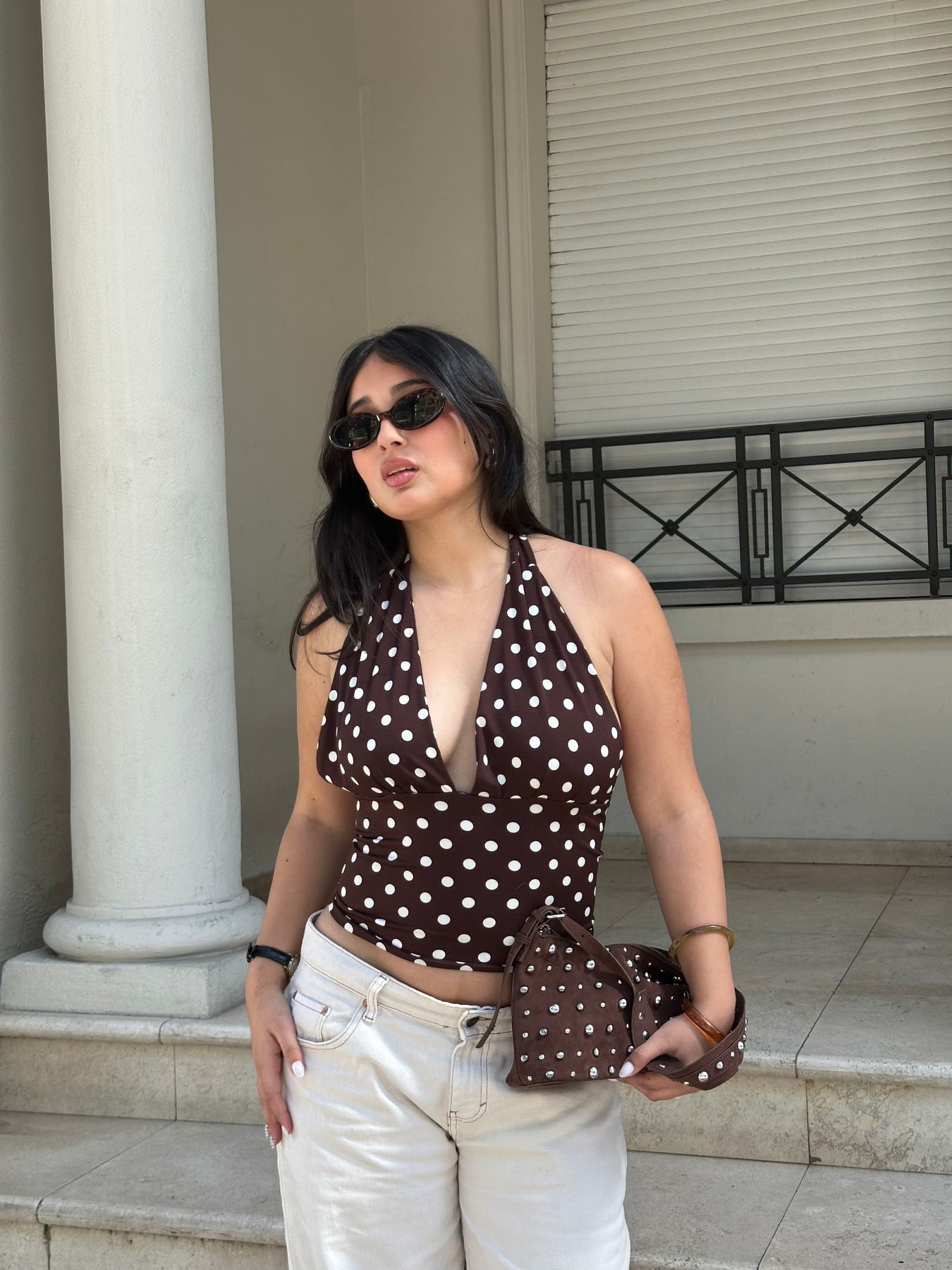Top renata + skinny scarf , pinzas en busto y doble tela amarrado en el cuello y sin espalda, corte recto por atrás.